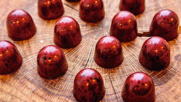 Efterfølgende arbejder Mads videre med chokoladen og viser, hvordan tempereringen kan bruges til at skabe smagfulde fyldte chokolader med balance, finesse og sanselig præcision.