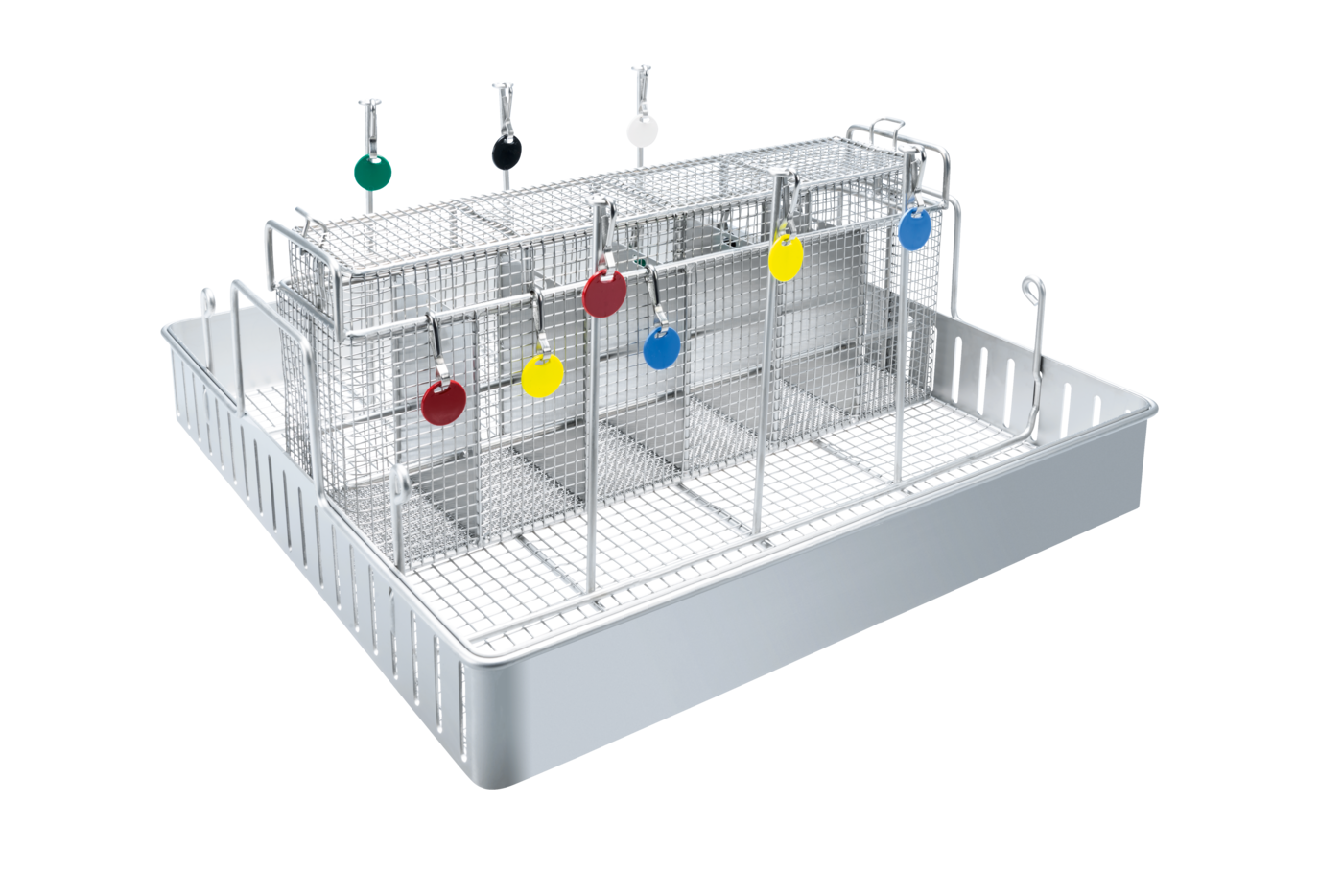 Indsatsens kurve gør det nemt og sikkert at placere utensilierne skånsomt i kurvene,til et optimalt rengøringsresultat. Der er et separat rum til smådele til hver lungeautomat og røgdykkermaske. - Tilbehør: 1 kurv til smådele med 6 farvemarkerede rumRum til smådele med farvemarkering