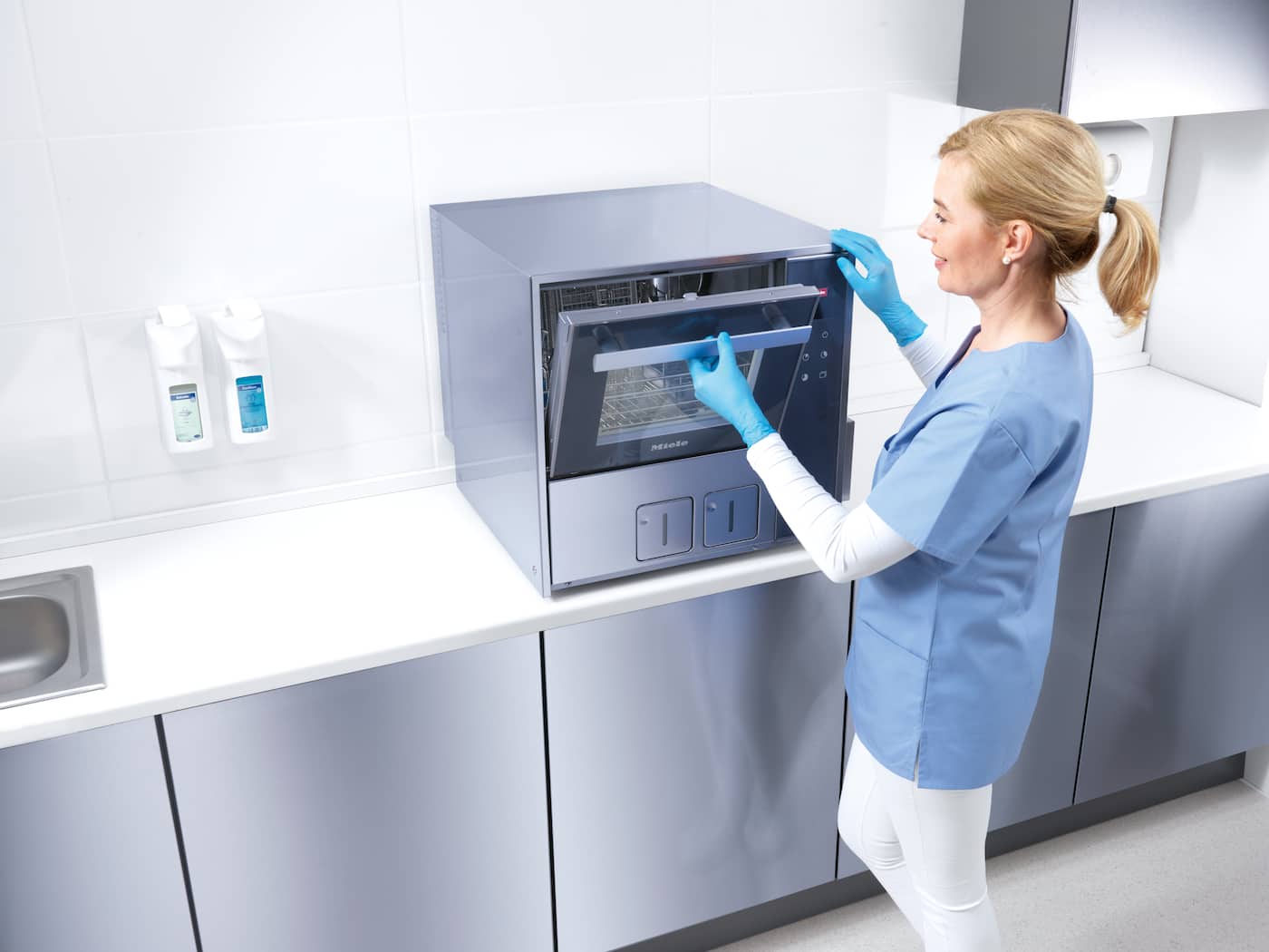 Der kan desuden rengøres flere instrumenter pr. fyldning, som for eksempel 3 dentalsiskåle (E 197) eller 8 små bakker samt sonder, mundspejle og pincetter. Hvis færre end 6 hånd- og vinkelstykker rengøres, kan antallet af spytsugere øges tilsvarende (op til maksimalt 12 stk.). - Mere effektivitet til mindre klinikker – kompakt konstruktionKompakt konstruktion